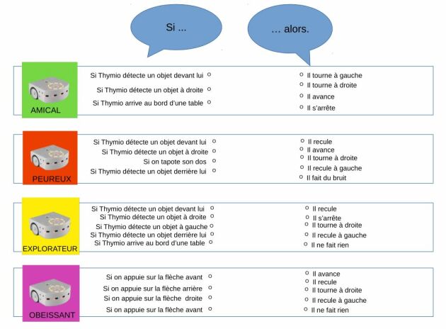 Lors de la précédente séance, nous avons vu que Thymio possède plusieurs comportements. Chaque comportement est associé à une couleur. Vous leur avez même donné un surnom.
