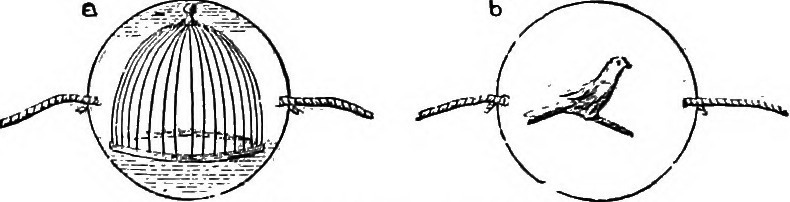 L'objet est alors un disque, maintenu par de part et d'autre par 2 élastiques, sur lequel on peut observer une cage sur une face et un oiseau sur l'autre (collé à l'envers par rapport à la cage). Ainsi, lorsqu'on fait tourner le disque suffisamment vite, on a l'illusion que l'oiseau est dans la cage.
